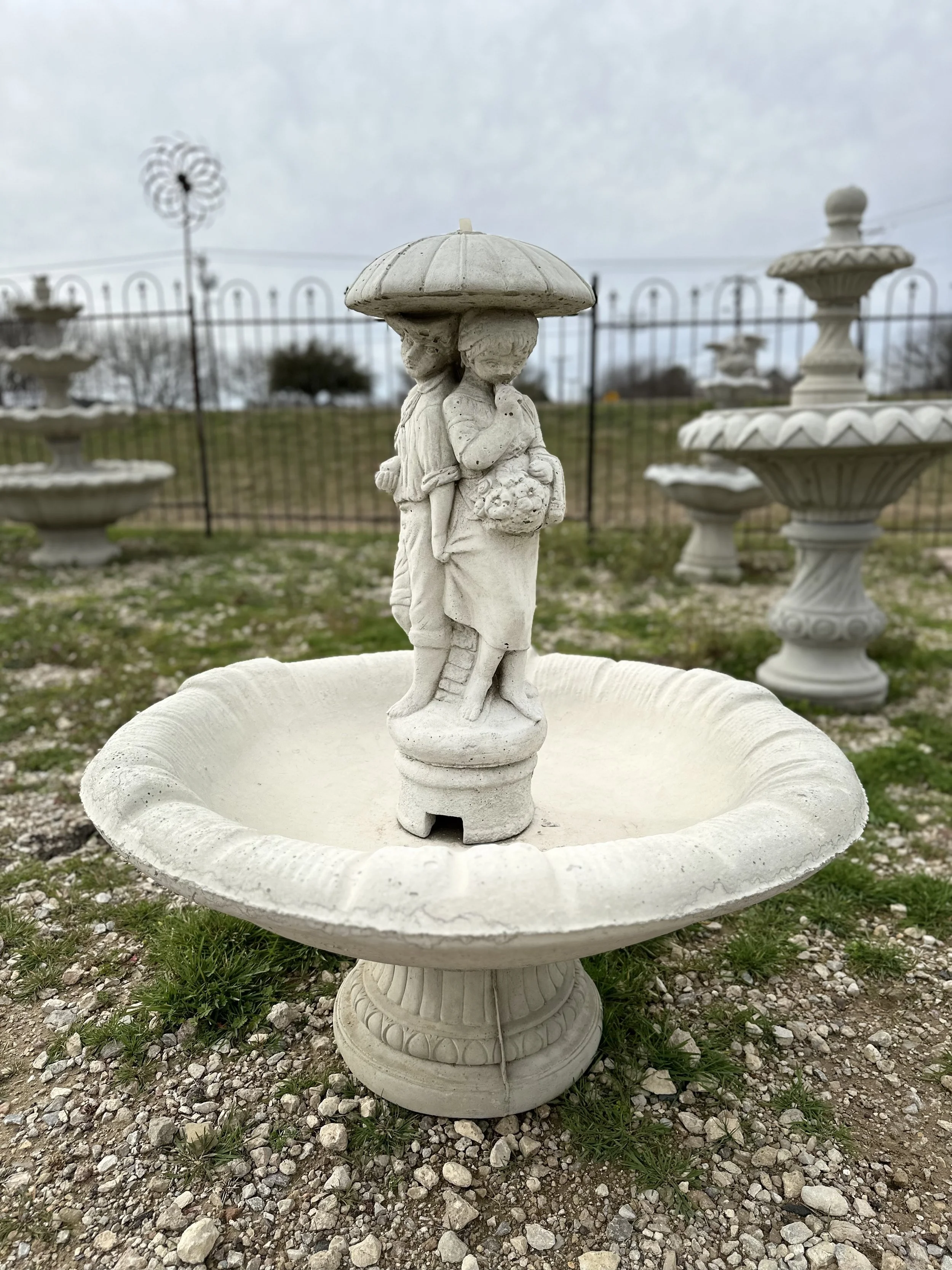 Introducing our enchanting "Lovers Fountain" – a timeless masterpiece that captures the essence of romance and tranquility. Crafted with precision in durable concrete, this unique fountain features a charming scene of a boy and a girl seeking shelter under an umbrella as water gracefully spouts down on them.